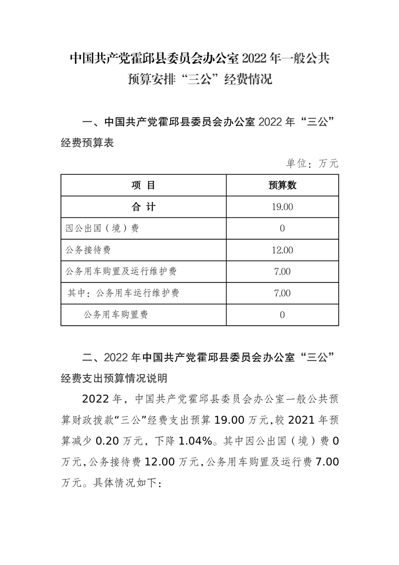 中国共产党霍邱县委员会办公室2022年一般公共预算安排“三公”经费情况
