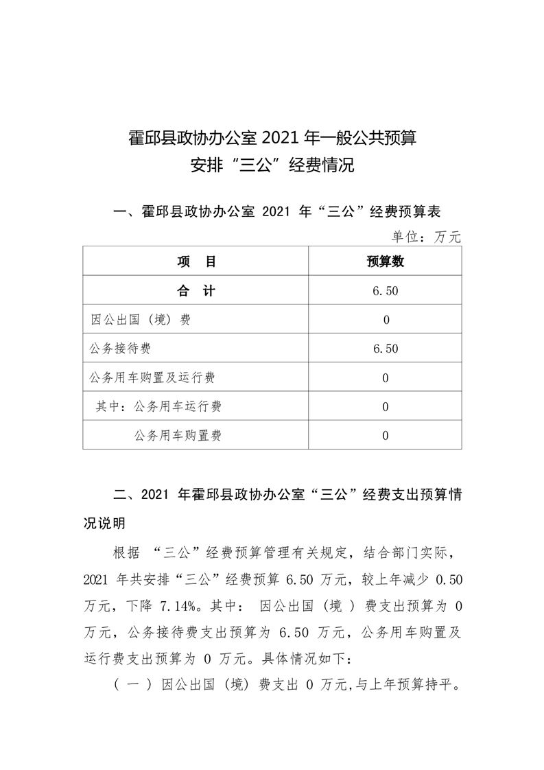 霍邱县政协办公室2021年部门“三公”经费预算公开