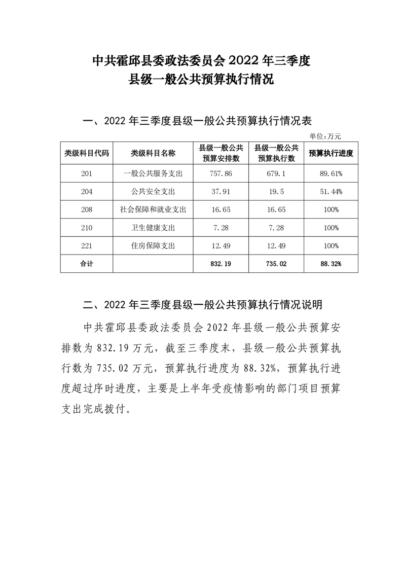 中共霍邱县委政法委员会2022年三季度县级一般公共预算执行情况