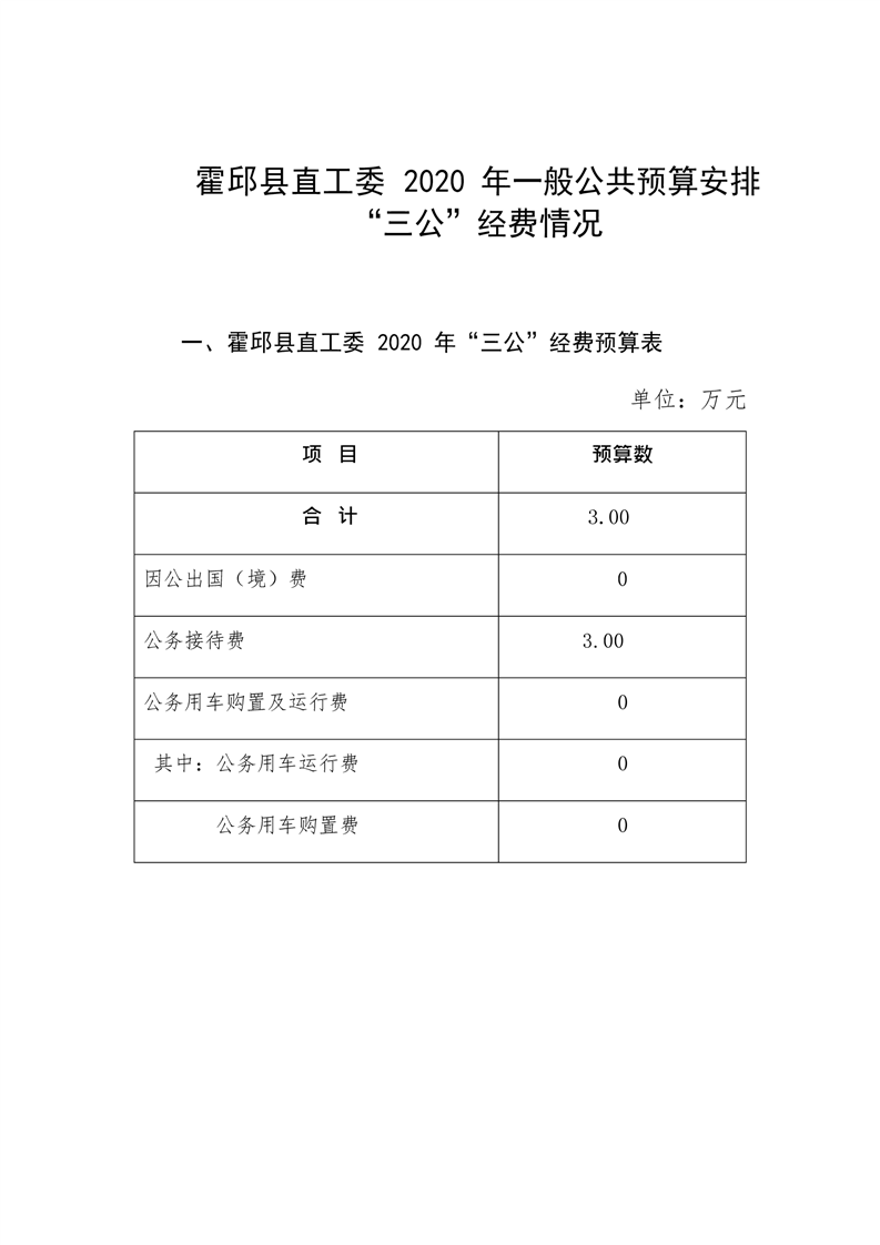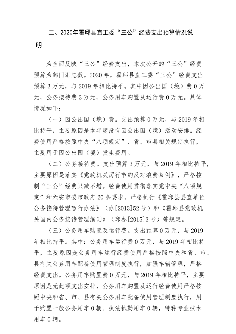 霍邱县直工委2020年一般公共预算安排“三公”经费情况