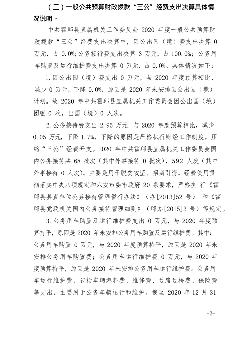 中共霍邱县直属机关工作委员会2020年度一般公共预算财政拨款“三公”经费支出决算情况说明