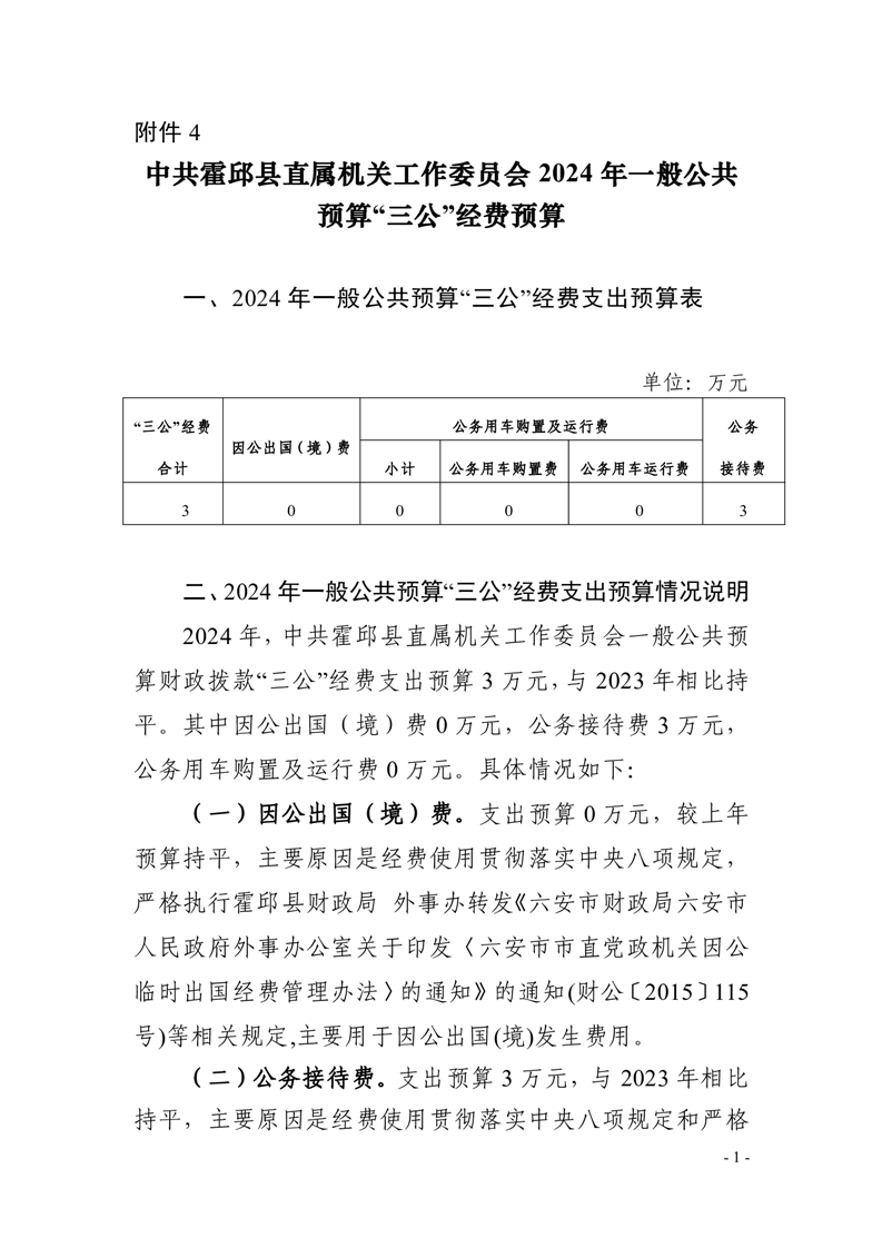 中共霍邱县直属机关工作委员会2024年部门单位一般公共预算安排“三公”经费情况