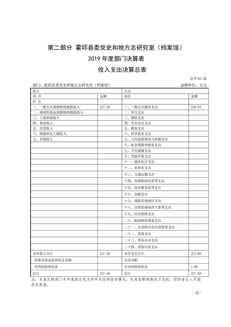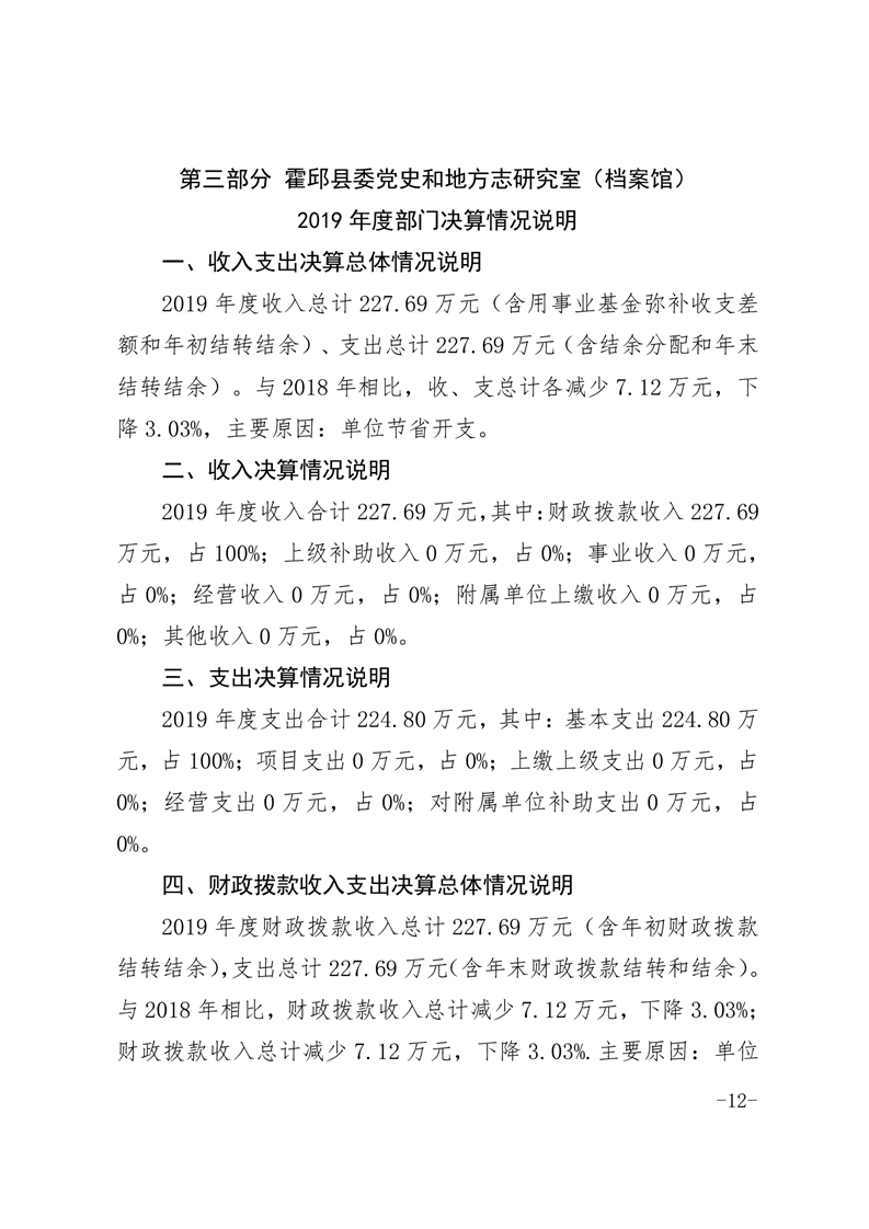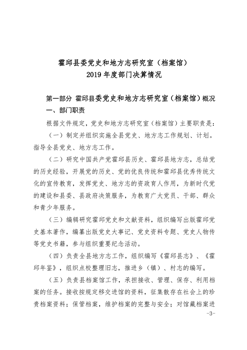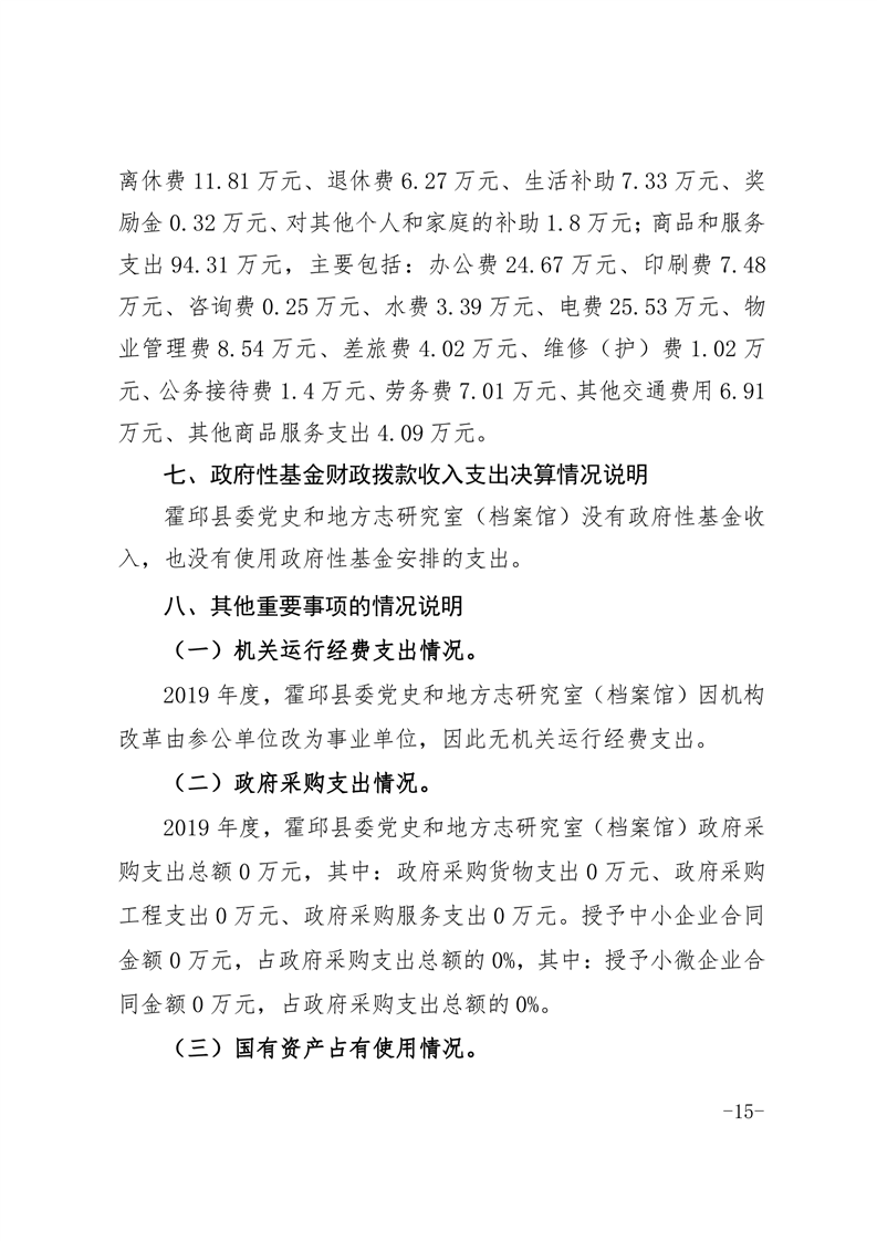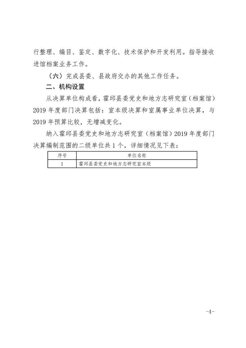 霍邱县委党史和地方志研究室(档案馆)2019年度部门决算公开情况