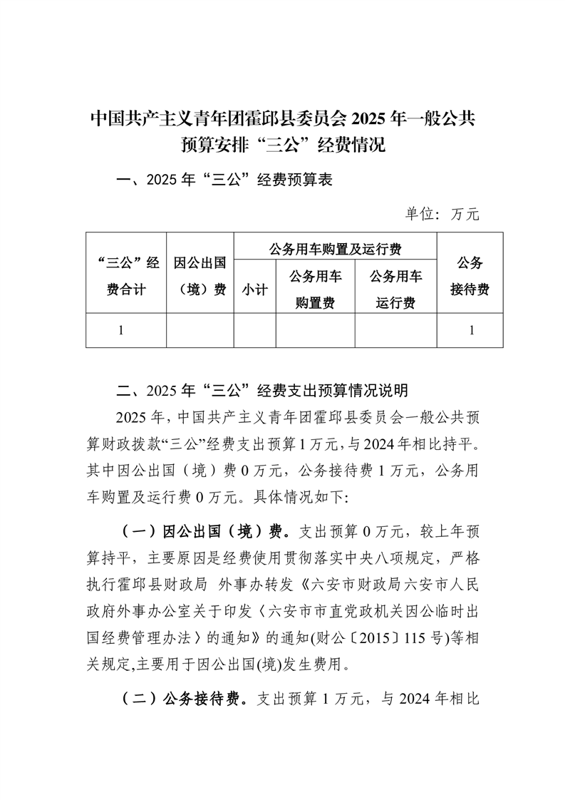 中国共产主义青年团霍邱县委员会2025年一般公共预算安排“三公”经费情况