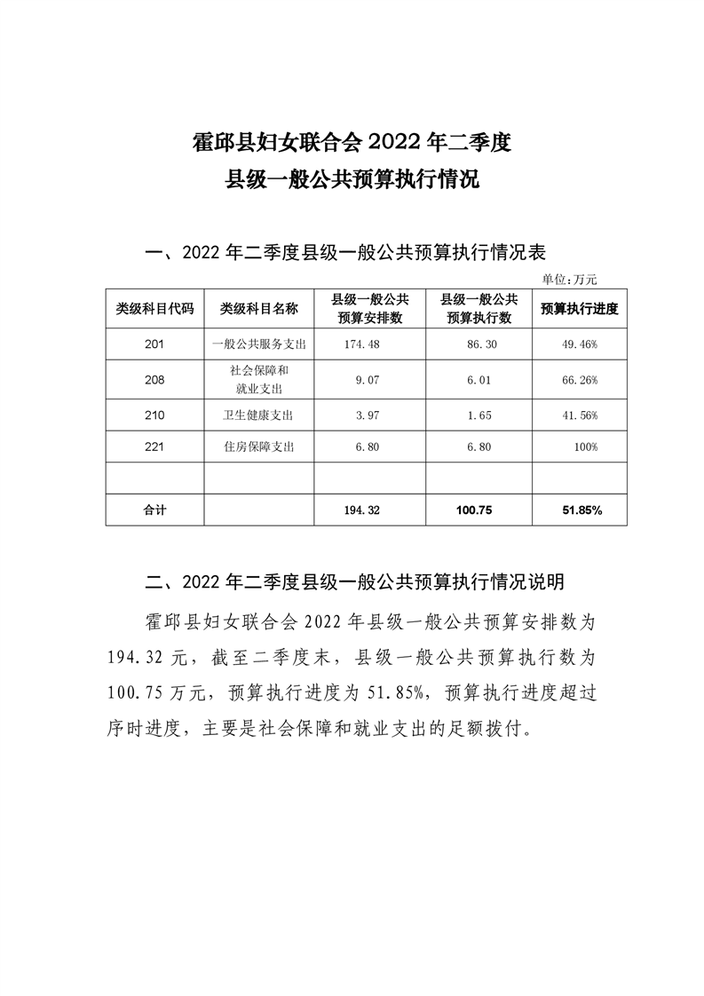霍邱县妇女联合会2022年二季度县级一般公共预算执行情况