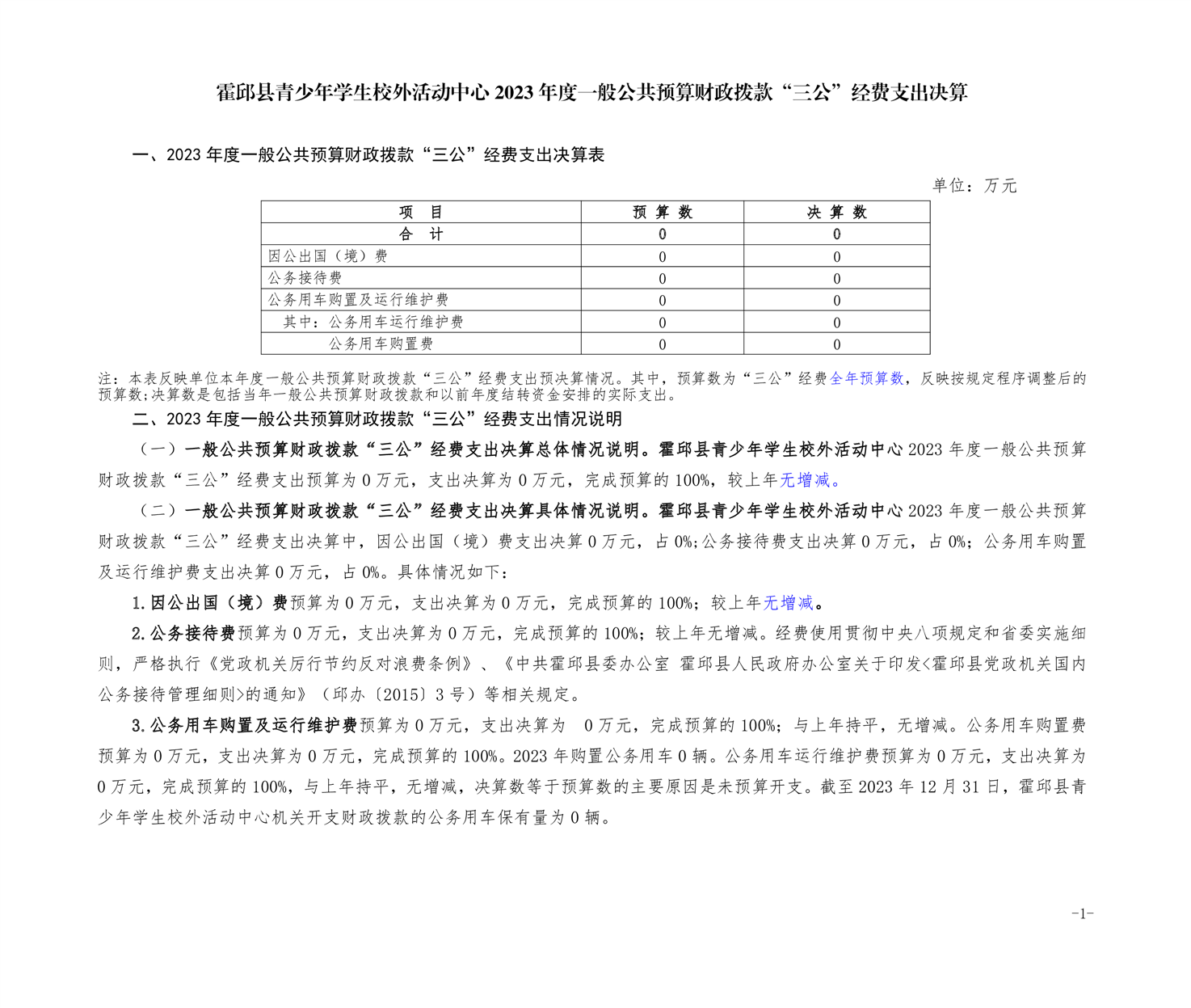 霍邱县青少年活动中心2023 年度一般公共预算财政拨款“三公” 经费支出决算表