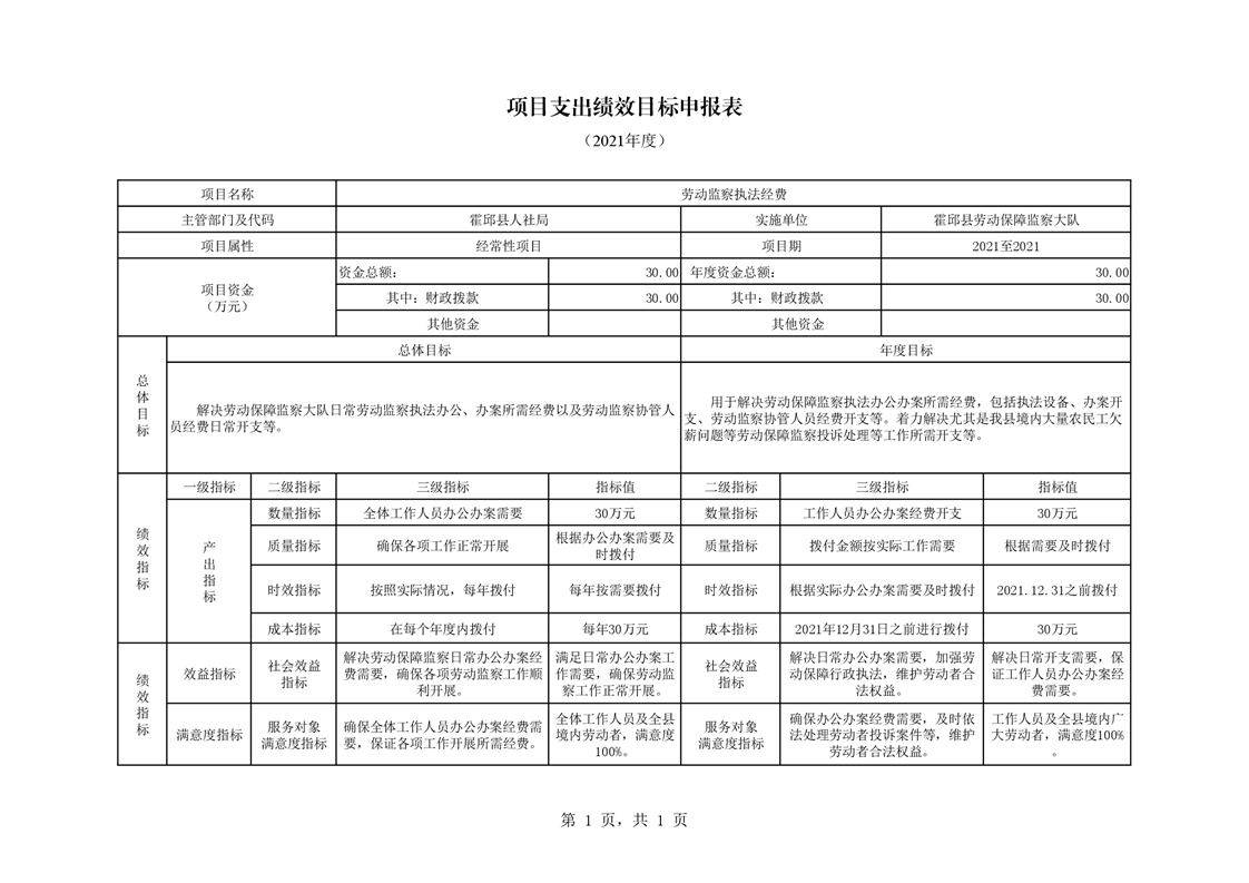 霍邱县劳动监察大队2021年项目支出绩效目标申报表