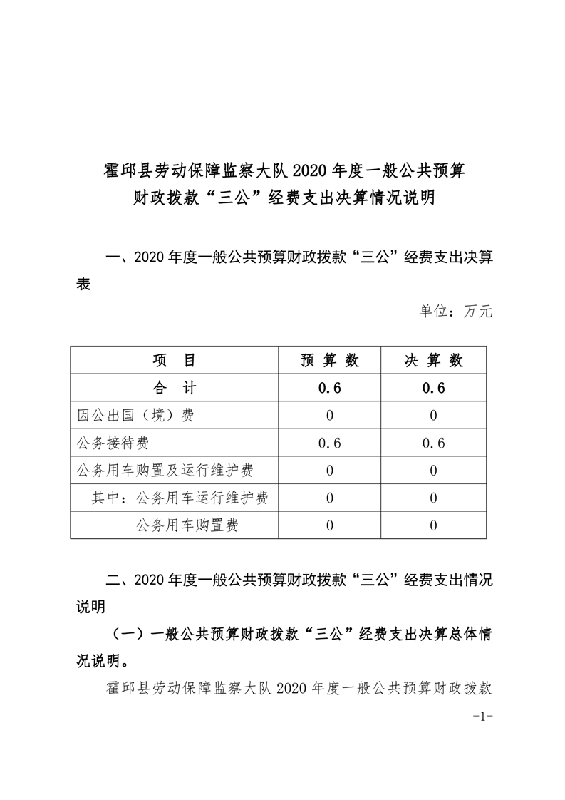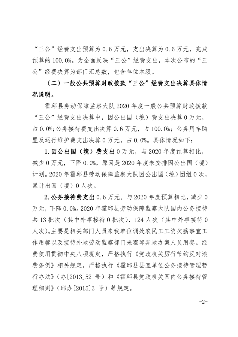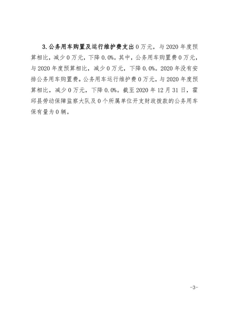 霍邱县劳动保障监察大队 2020 年度一般公共预算 财政拨款“三公”经费支出决算情况说明