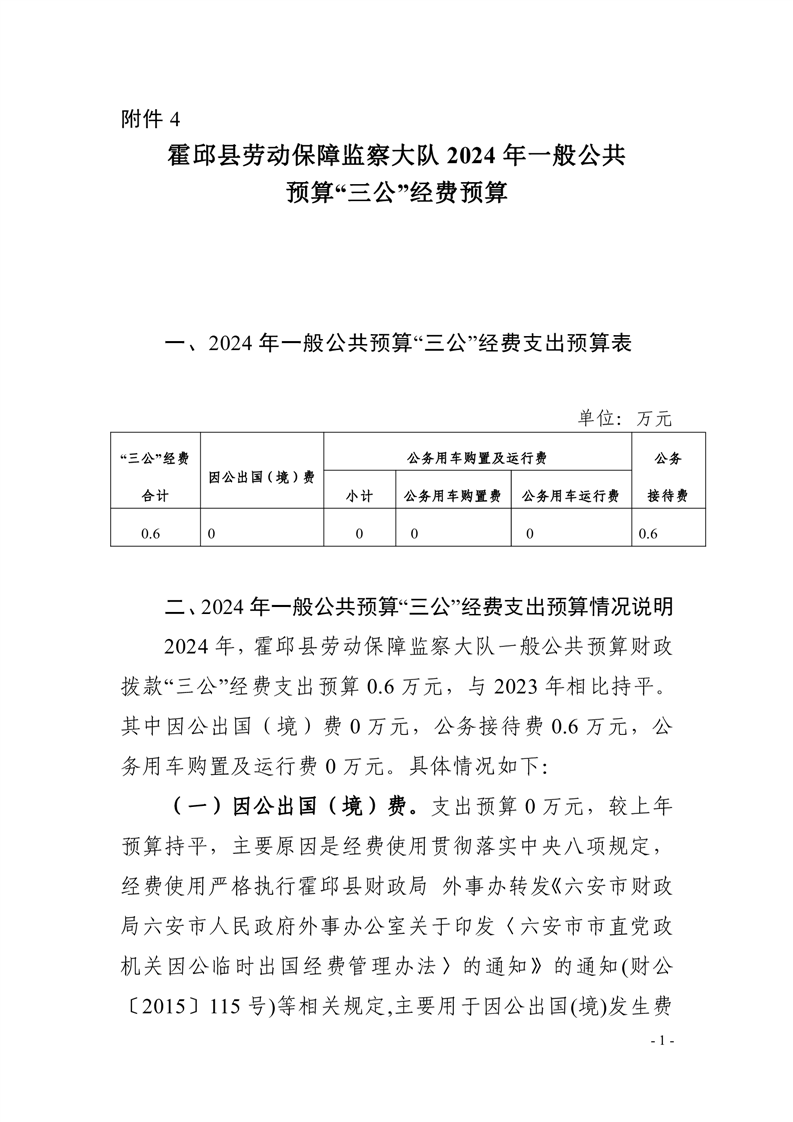 霍邱县劳动保障监察大队 2024 年度一般公共预算财政拨款“三公”经费支出决算公开