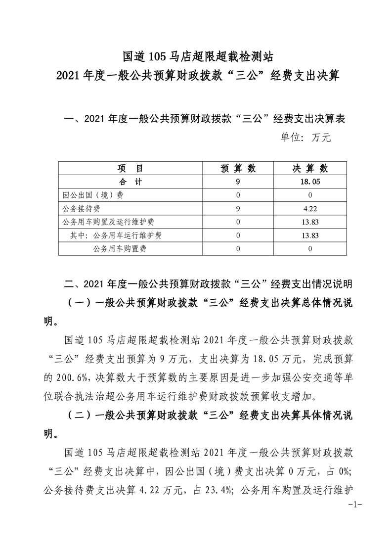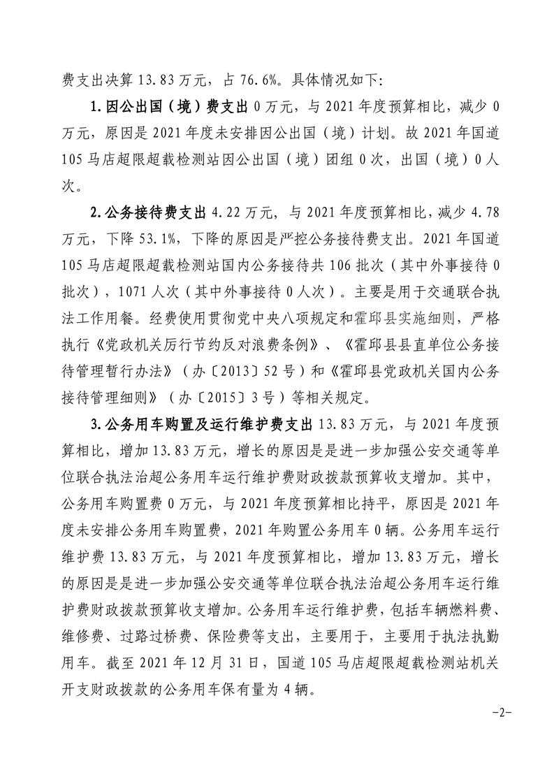 国道105马店超限超载检测站2021年度一般公共预算财政拨款“三公”经费支出决算