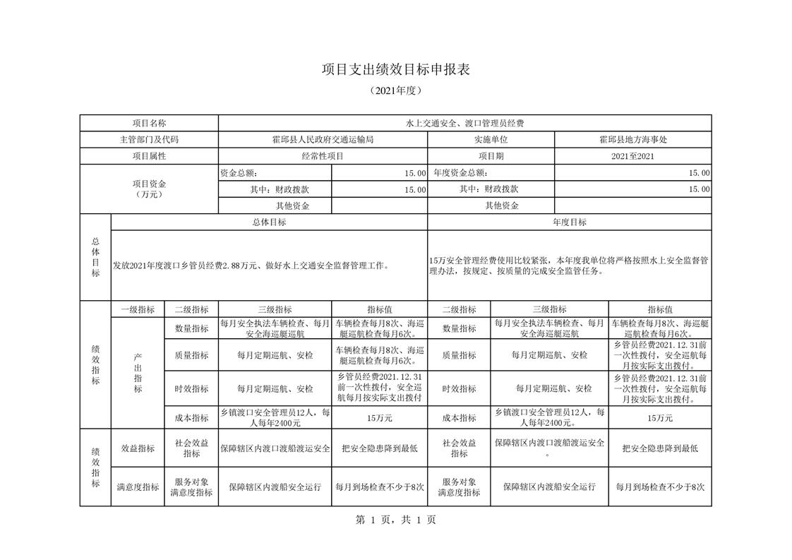 霍邱县地方海事处2021年专项绩效目标公开明细表
