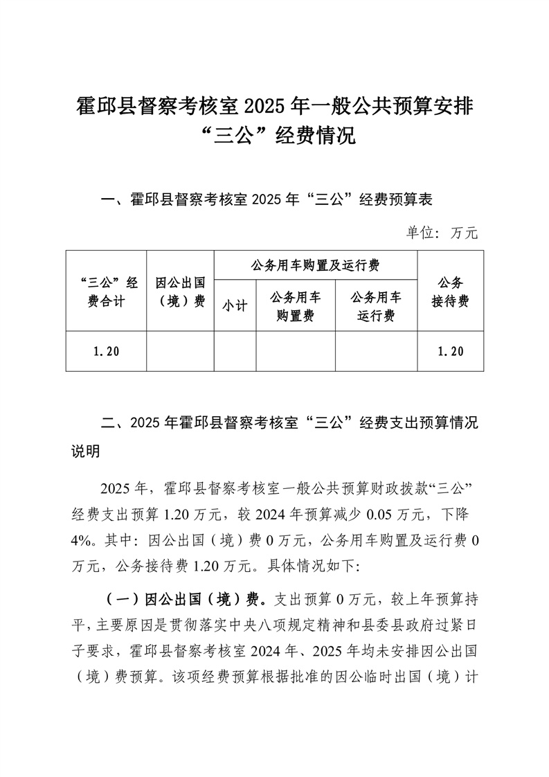 霍邱县督察考核室2025年一般公共预算安排“三公”经费情况