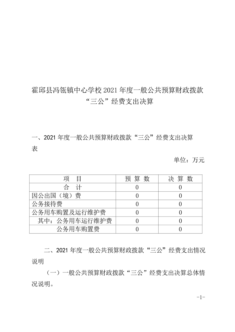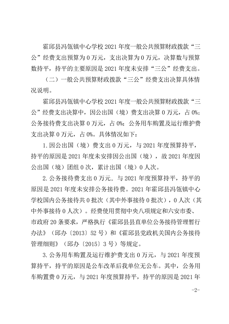 霍邱县冯瓴中心校2021年度一般公共预算单位财政拨款三公经费支出决算公开