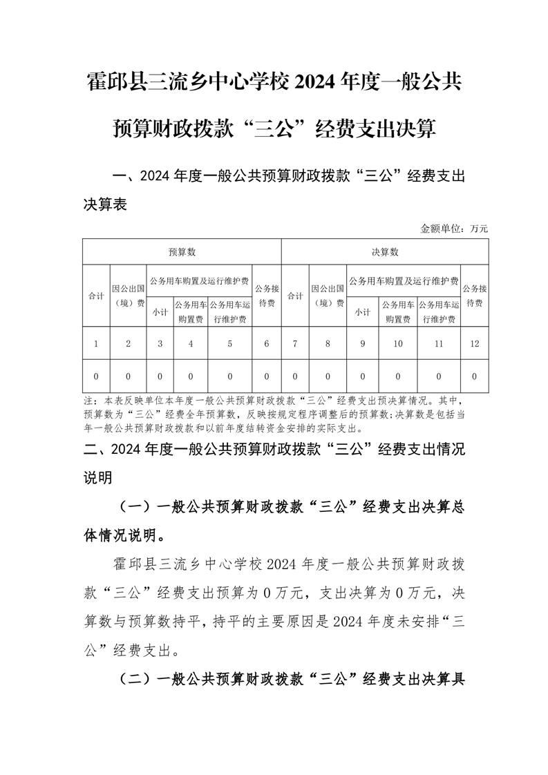霍邱县三流乡中心学校2024年度一般公共预算财政拨款“三公”经费支出决算