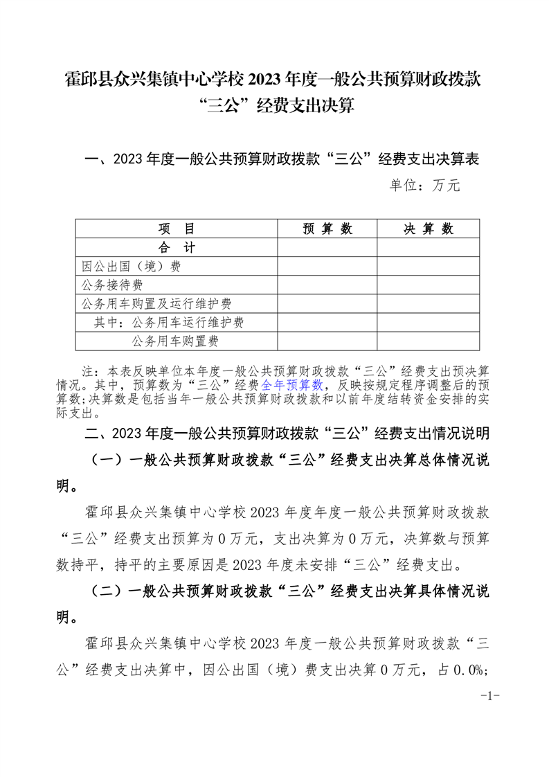 霍邱县众兴集镇中心学校 2023 年度一般公共预算财政拨款“三公” 经费支出决算