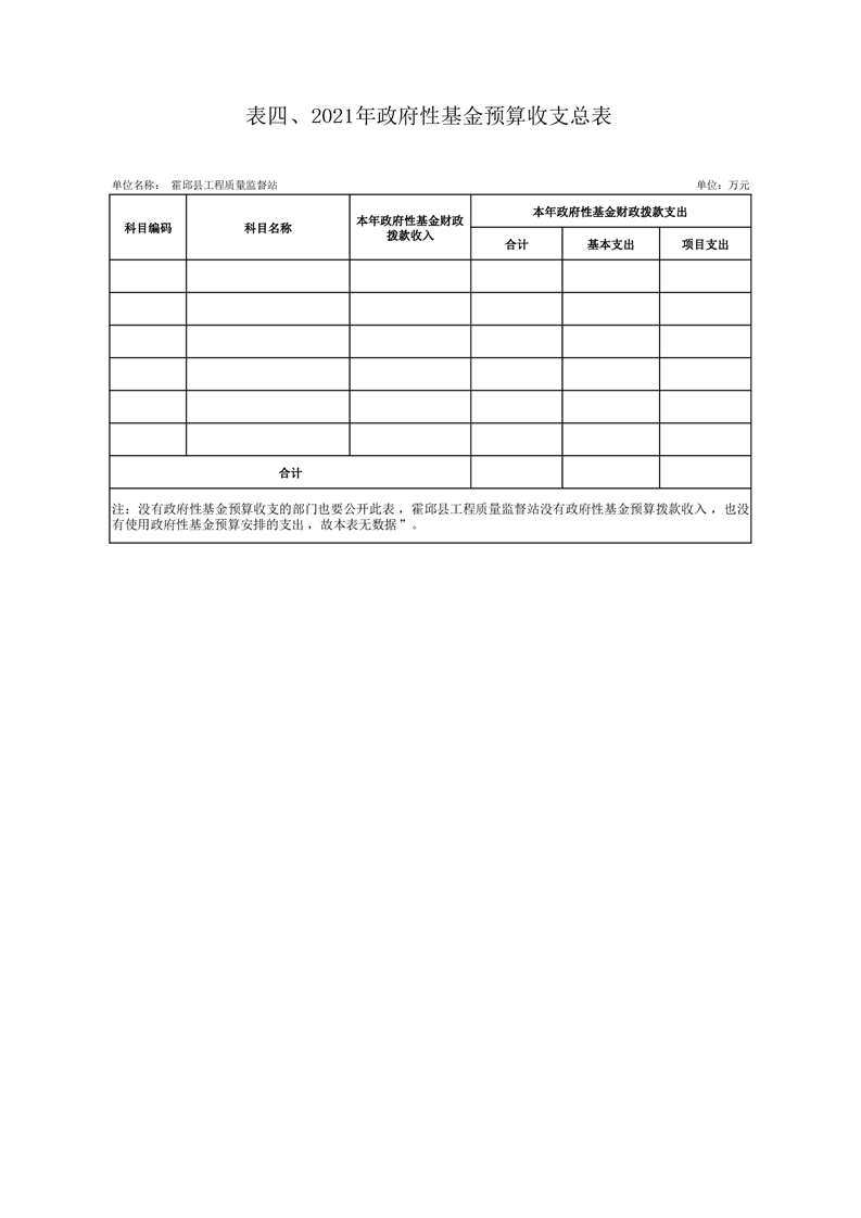 霍邱县工程质量监督站2021年政府性基金收入预算0万元。