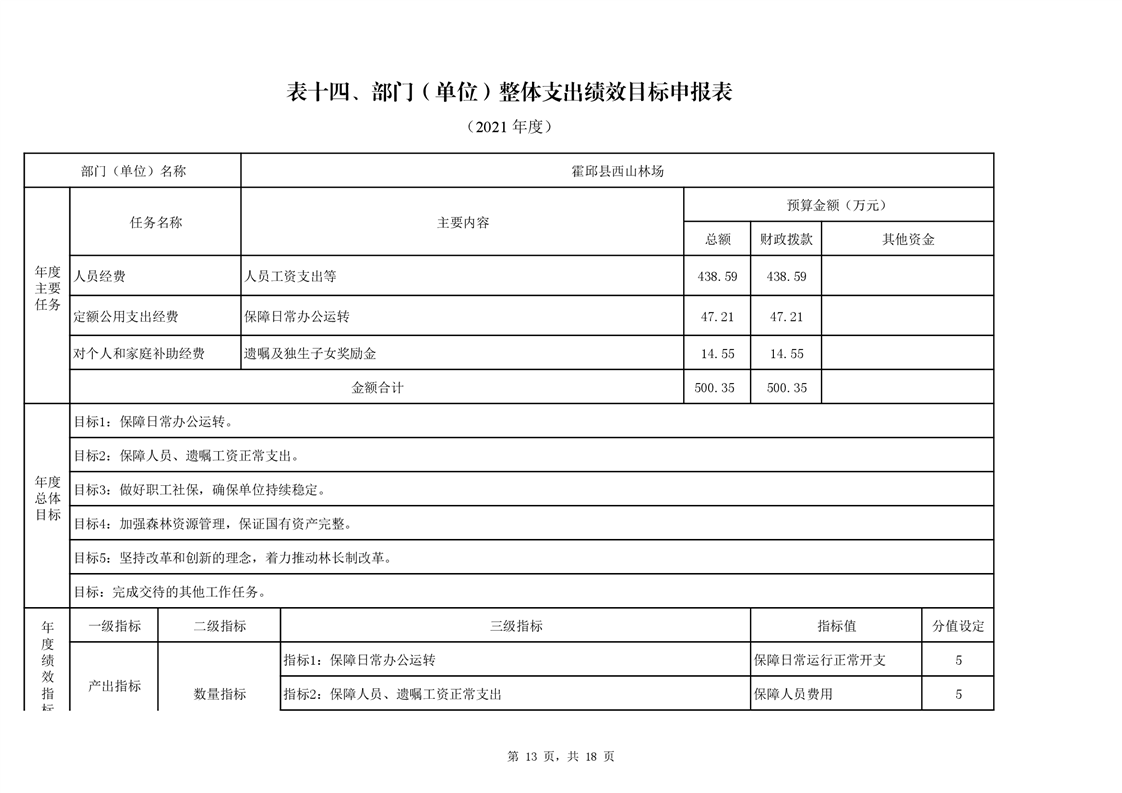 霍邱县西山林场2021年单位预算表由以下14张表格构成,具体表格内容见附表。