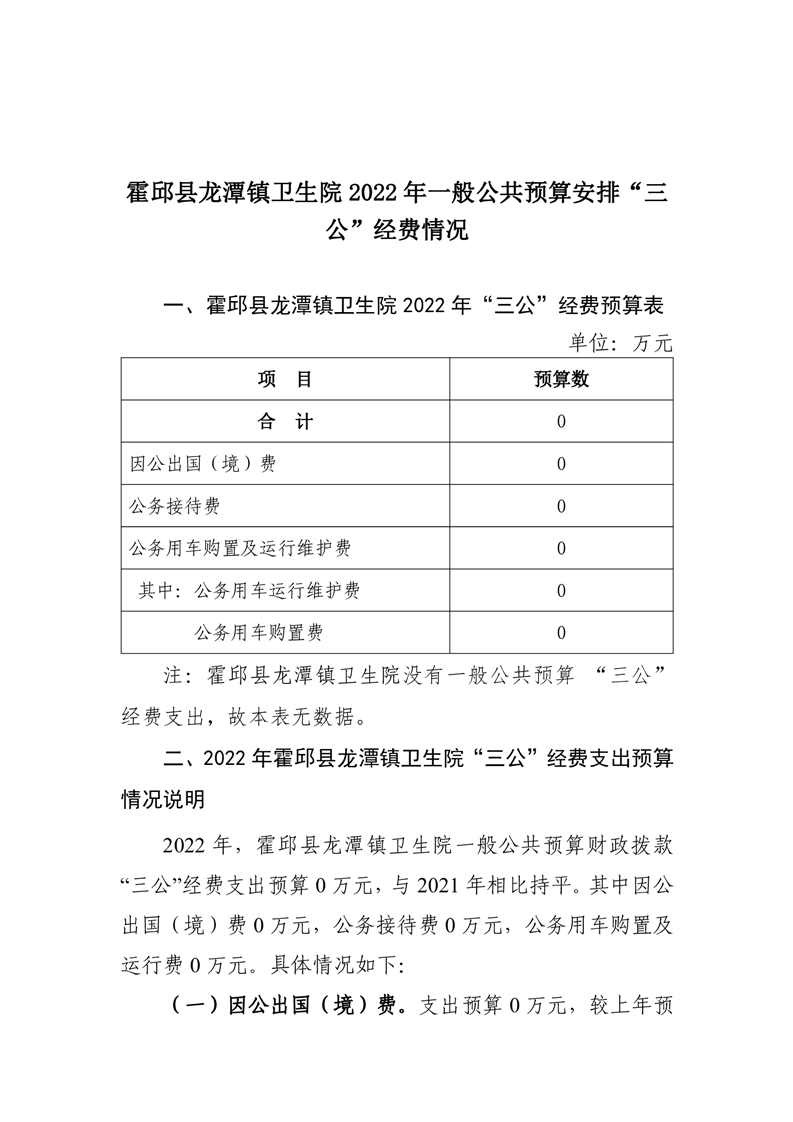 霍邱县龙潭镇卫生院2022年度一般公共预算安排“三公”经费情况公开