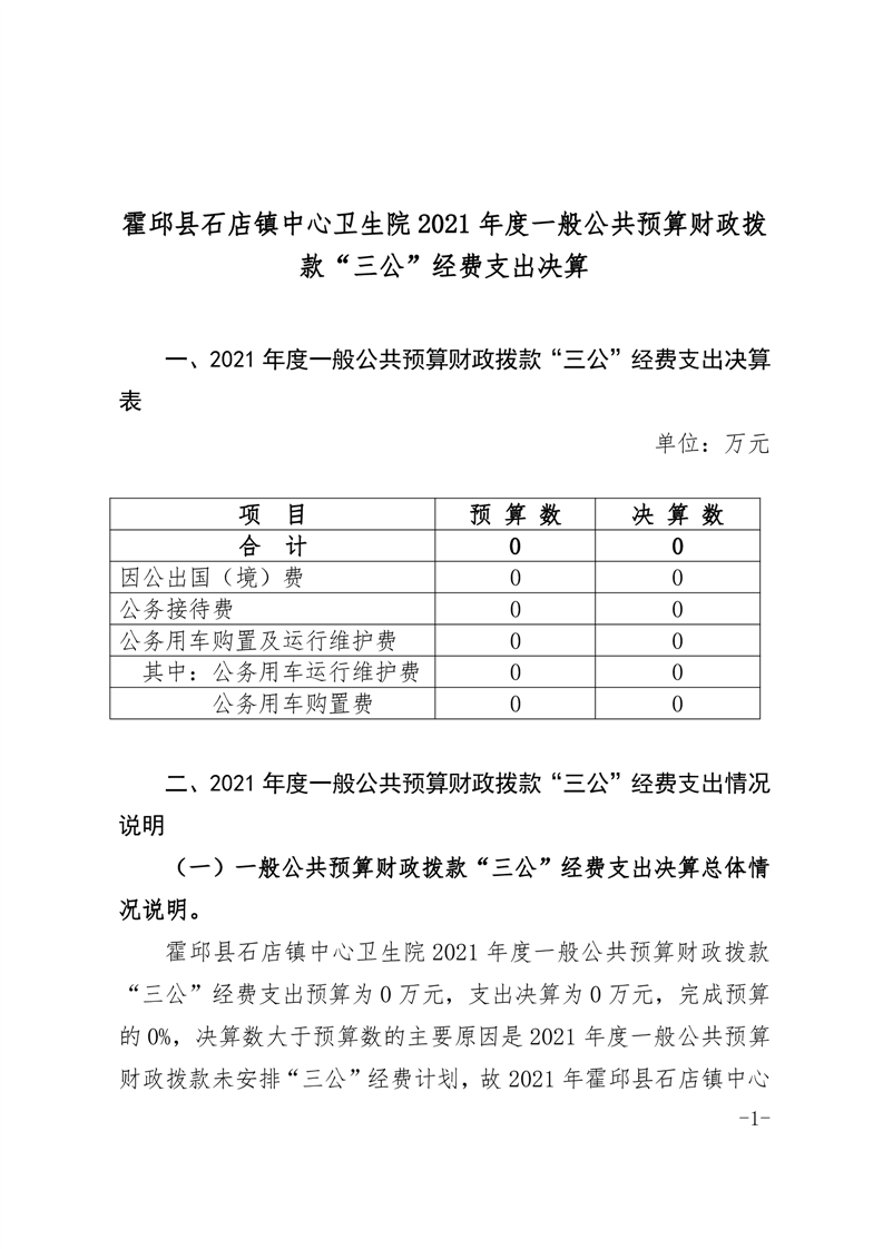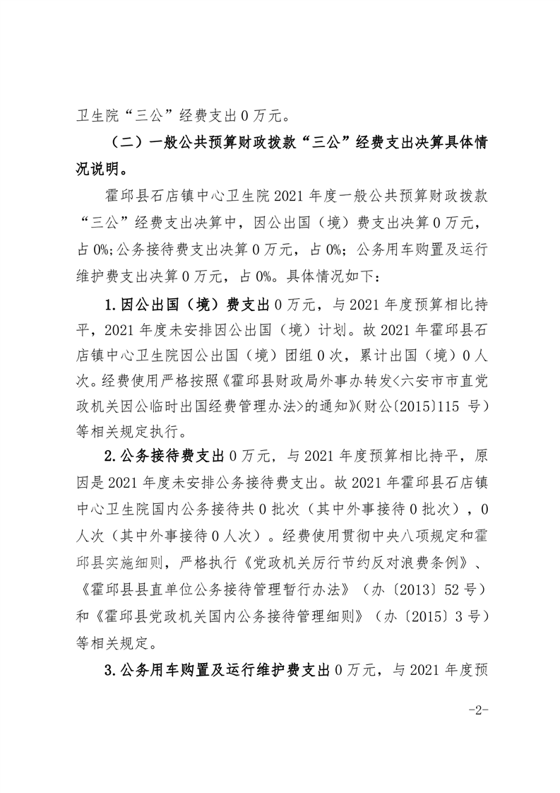 霍邱县石店镇中心卫生院2021年度一般公共预算财政拨款“三公”经费支出决算公开