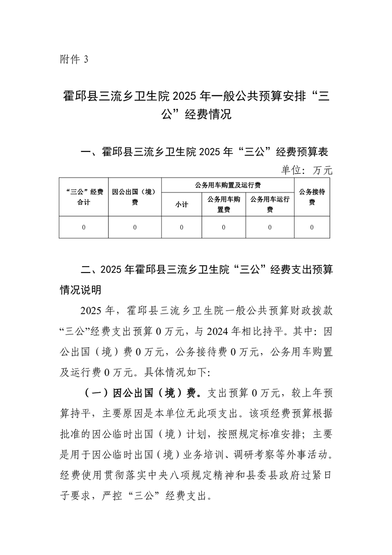 霍邱县三流乡卫生院2025年部门单位一般公共预算安排“三公”经费情况公开